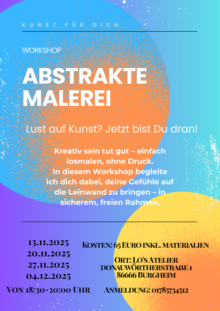 In meinen Workshops arbeiten wir in einem kleinen, persönlichen Rahmen von drei Personen. Ich zeige dir unterschiedliche Wege, abstrakt zu malen – von einfachen Techniken bis zu spannenden Experimenten. Danach bist du frei, deine eigene Bildsprache zu entdecken und umzusetzen.