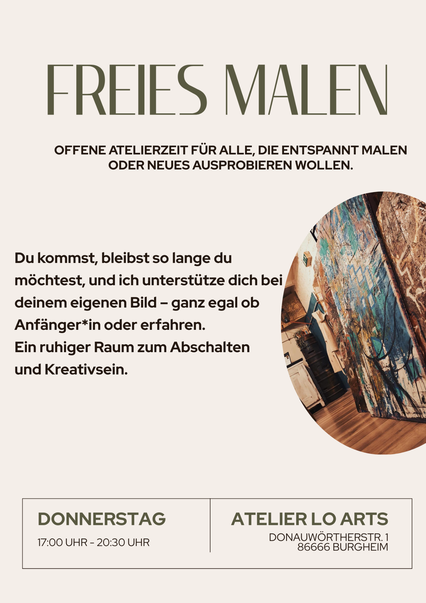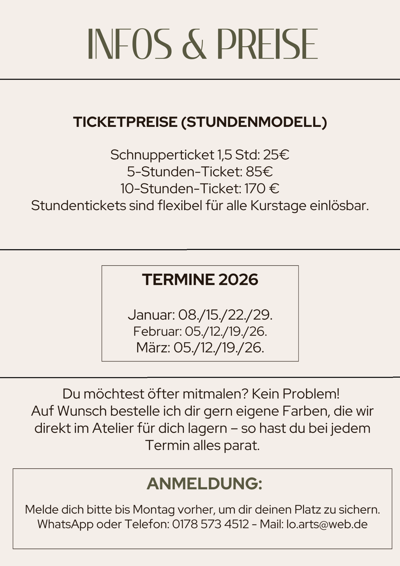 Du zahlst nur die Zeit, die du wirklich im Atelier verbringst. Ganz egal, ob du 1,5 Stunden oder den ganzen Abend malen möchtest – deine Stundenkarte wird einfach passend abgebucht. So kannst du jedes Mal spontan entscheiden, wie lange du bleiben willst.