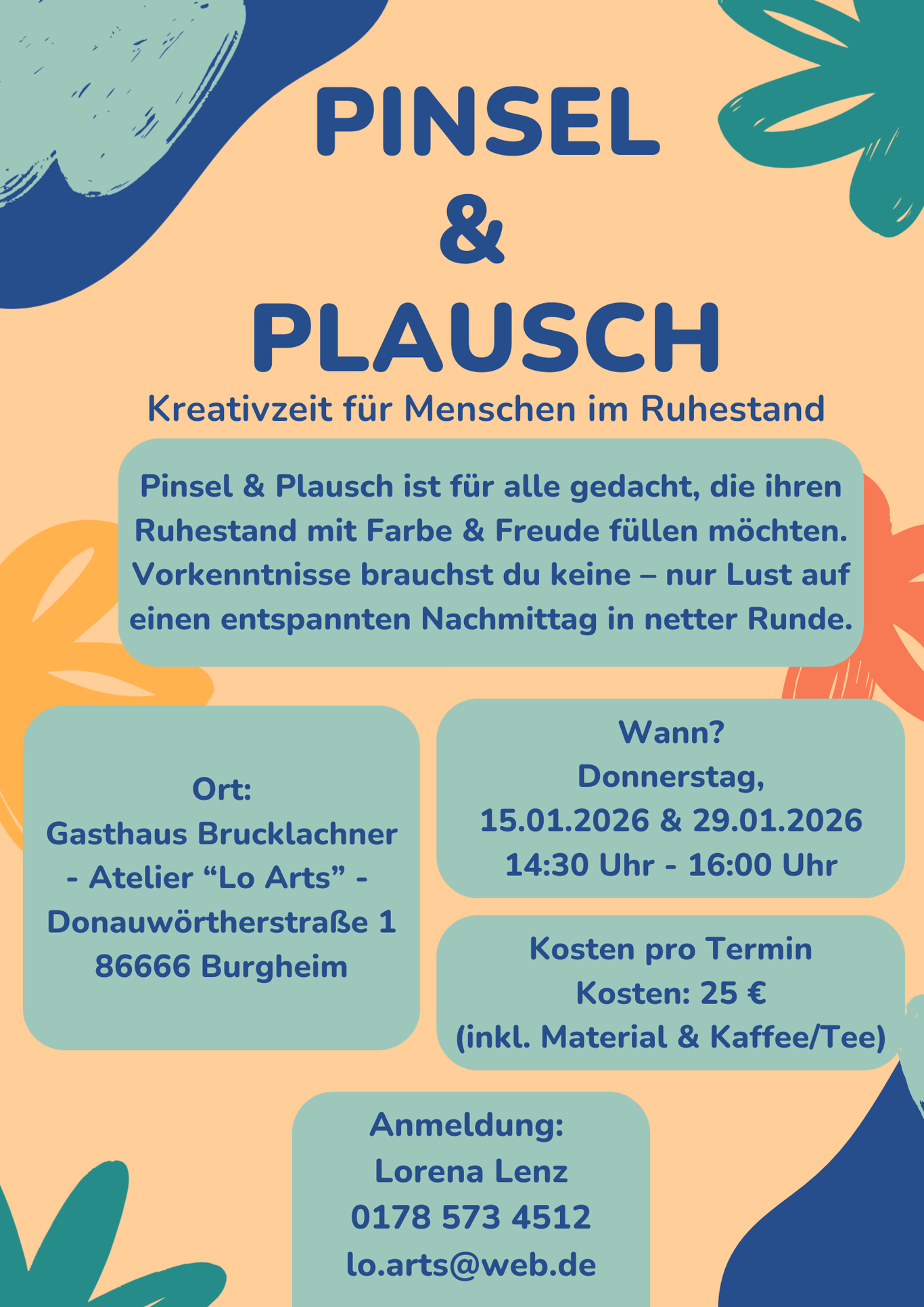 Mit Pinsel & Plausch öffne ich mein Atelier für alle Menschen im Ruhestand, die Lust auf eine entspannte Auszeit voller Farbe haben. In einer ruhigen, wertschätzenden Atmosphäre kannst du neue Maltechniken ausprobieren, eigene kleine Kunstwerke gestalten und dabei ganz in deinem Tempo kreativ werden – ohne Druck, ohne Vorkenntnisse, einfach mit Freude am Tun.